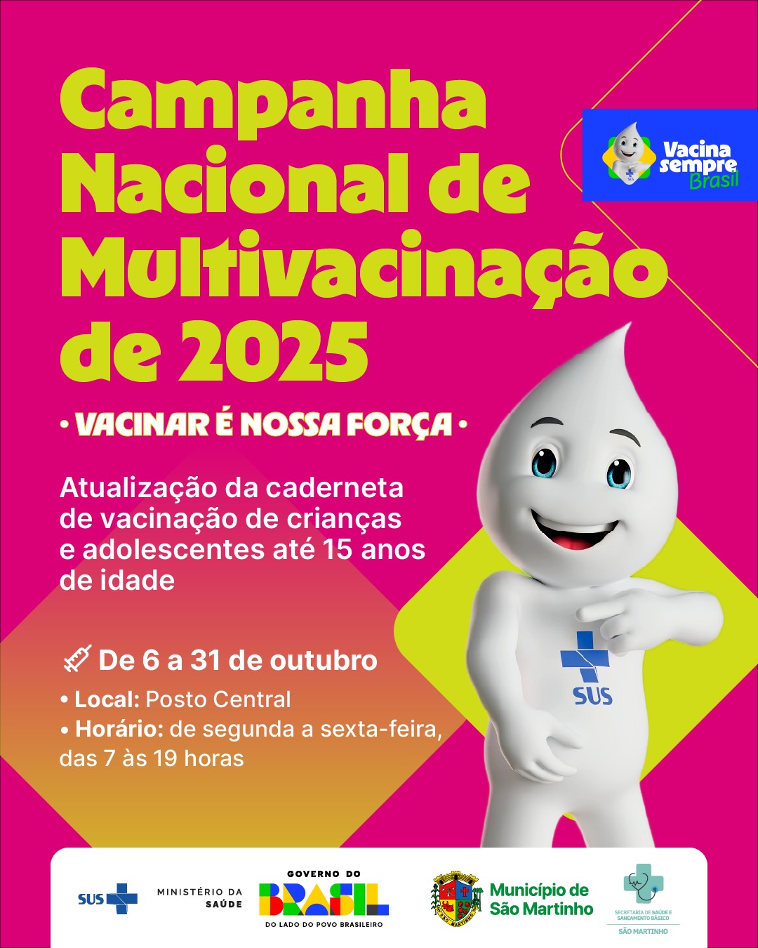 O Ministério da Saúde iniciará nesta segunda-feira (6) a Campanha Nacional de Multivacinação, destinada a crianças e adolescentes com até 15 anos de idade. A ação visa atualizar a caderneta de vacinação do público-alvo, com foco em imunizantes contra doenças como sarampo, poliomielite e hepatite. A campanha ocorrerá até o dia 31 de outubro, com o Dia D de mobilização marcado para o dia 18/10, quando os postos de saúde estarão abertos para atender a população. Mais de 6,8 milhões de doses foram distribuídas para a ação, que contará com unidades móveis, ampliação dos horários de funcionamento das salas de vacina e busca ativa de não vacinados